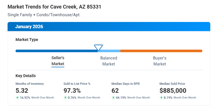 Below is a market report for single-family homes and condos/townhomes in Cave Creek. It covers real estate activity including home sales, new homes to market, price reductions, pending sales and more.
