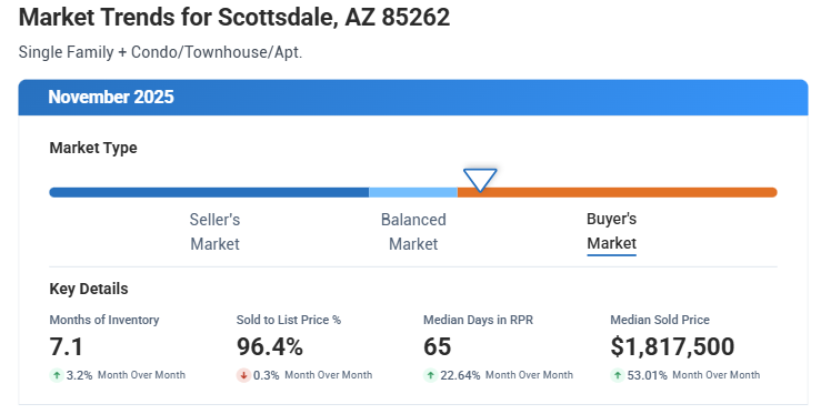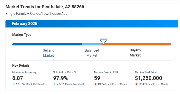 Below are comprehensive market reports for single-family homes and condos/townhomes in the North Scottsdale zip codes of 85255, 85262 and 85266. They cover real estate activity, including home sales, new homes to market, price reductions, pending sales and more.
